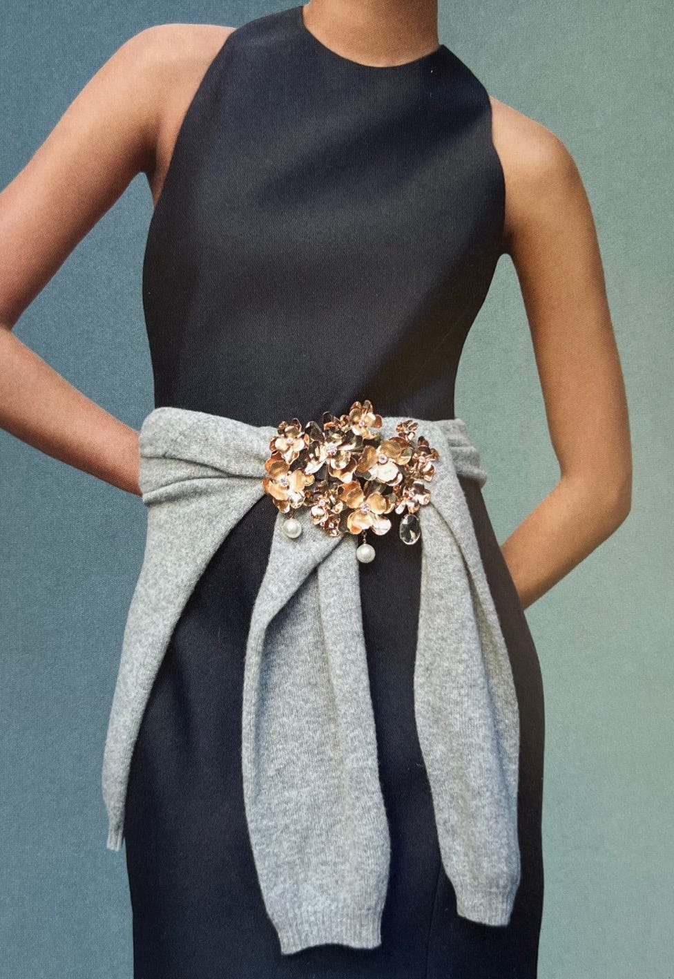 Smitten with the styling in this photo from Frederic Magazine with the statement making Carolina Herrera (sold out, but this one is great too) brooch pinned onto the casually tied sweater around her waist. This would be great to recreate with a rarely worn brooch or even earrings pinned on for holiday events!
