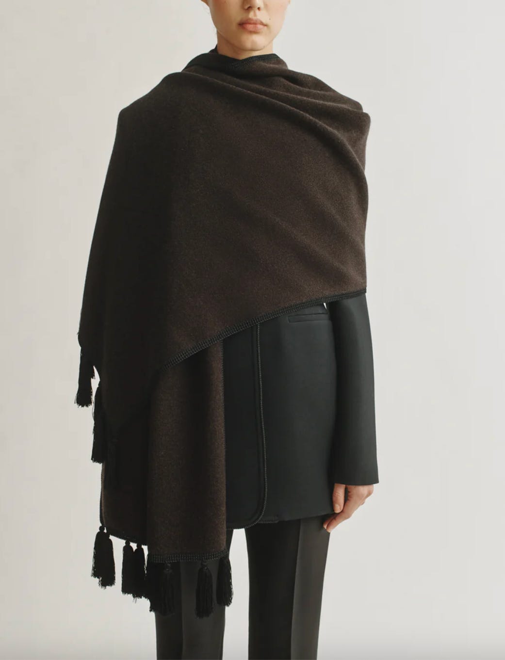 The ultimate cashmere wrap that would go with anything as it’s both chocolate brown and black.